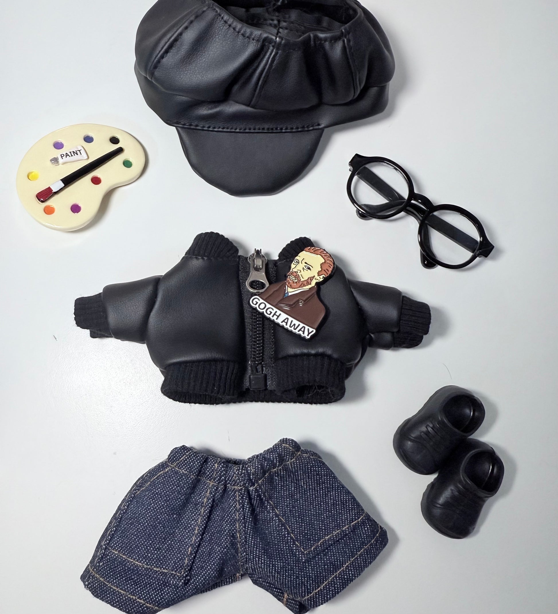 The miniature painter’s palette adds the perfect finishing touch, making your Labubu look like they’re about to pick up the brush and start a brand-new canvas. Whether for display, photography, or building your creative theme collection, this outfit adds depth, attitude, and a touch of humor with the “GOGH AWAY” pin inspired by classic art culture.