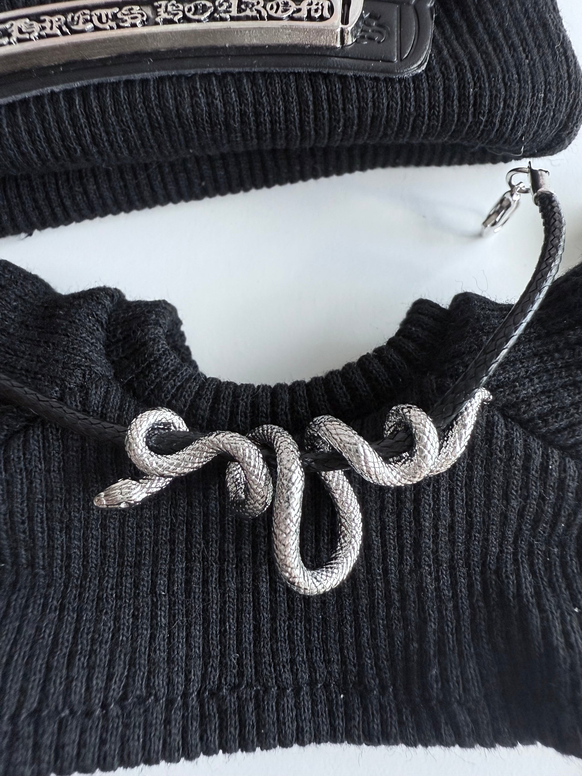 This set includes a ribbed knit beanie with metallic detail, round dark sunglasses, short-sleeve knit top, matching shorts with a bird patch, glossy boots, and a silver snake necklace finishing the attitude.