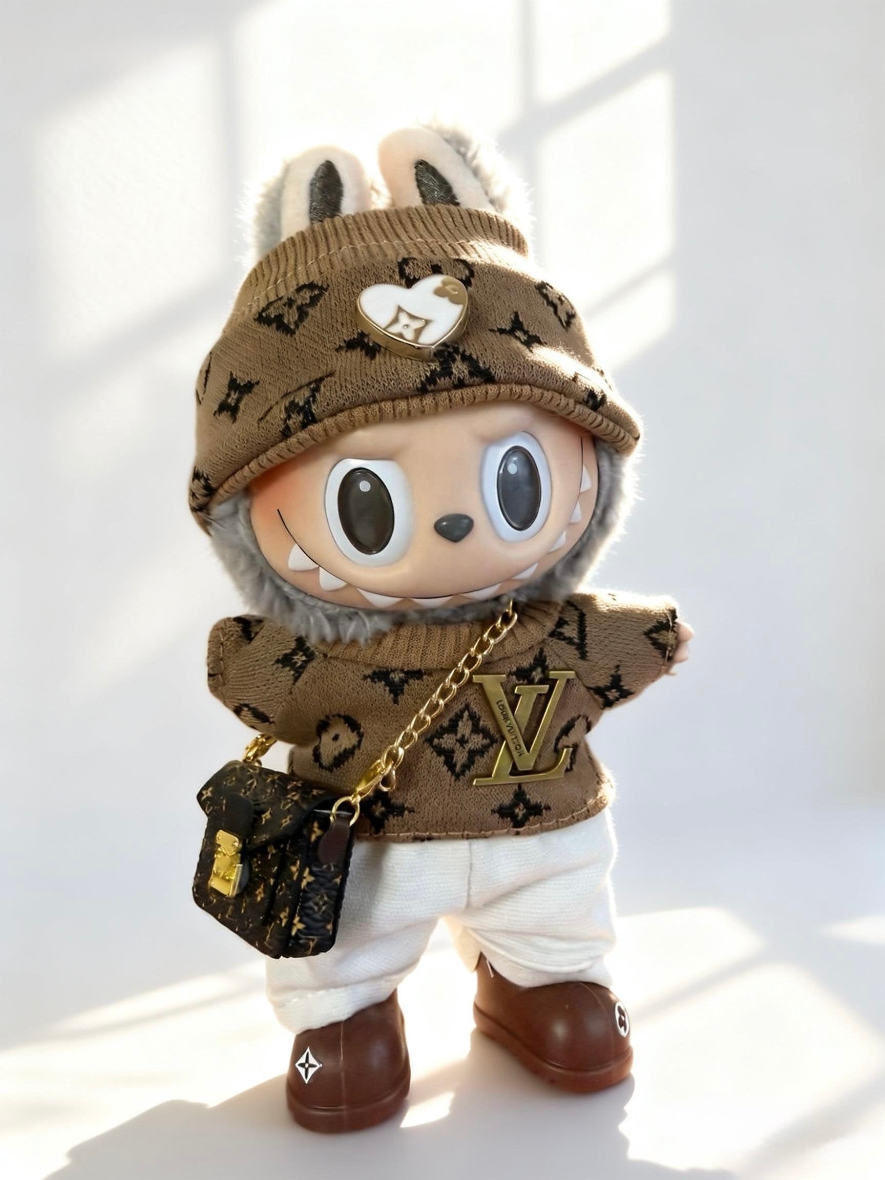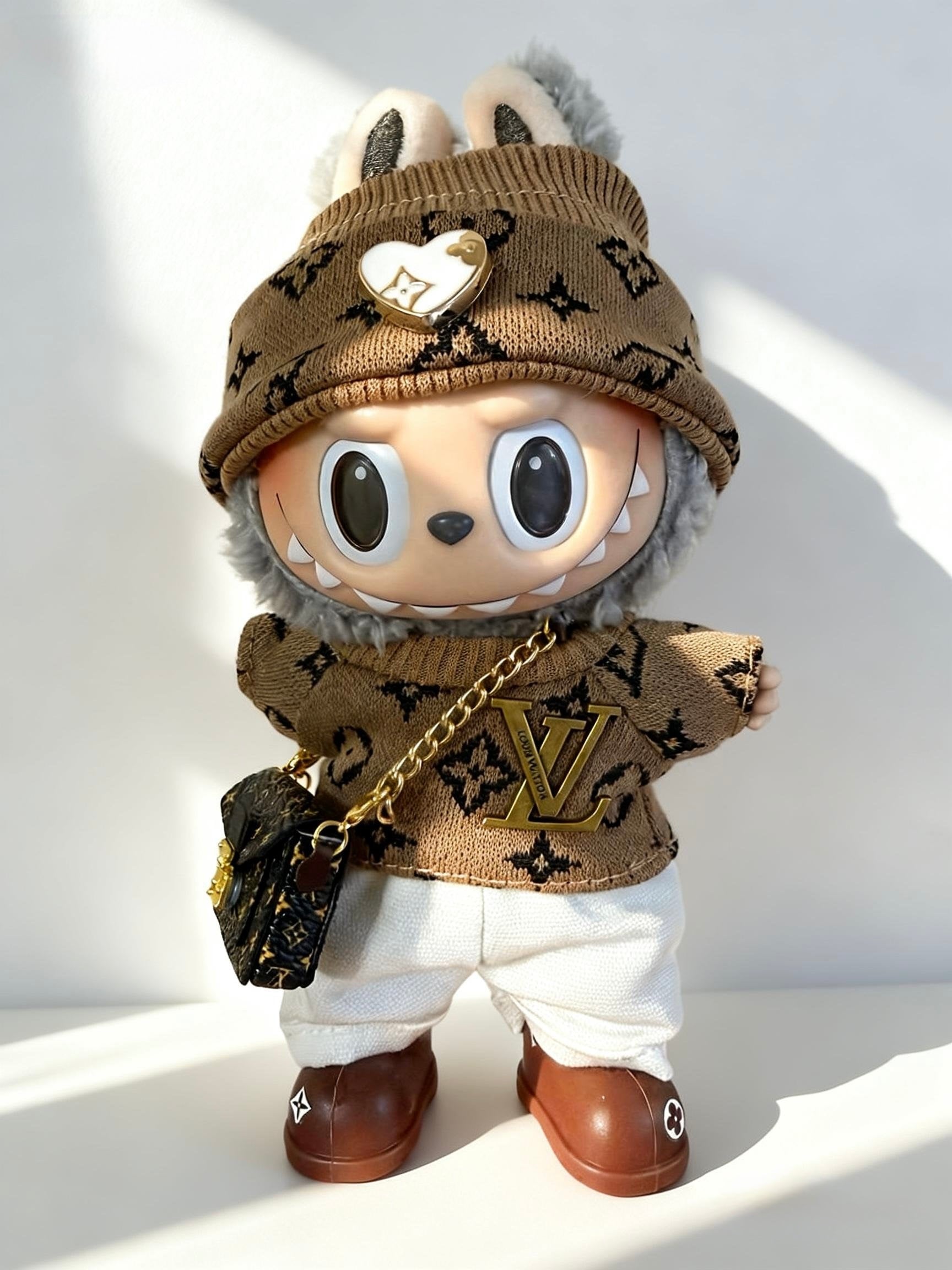 A warm neutral-toned streetwear look featuring a soft monogram knit top, matching knit hat, crisp white shorts, and mini crossbody bag. Blending luxury-inspired details with playful charm, this outfit creates an effortless everyday fashion style for your Labubu doll.