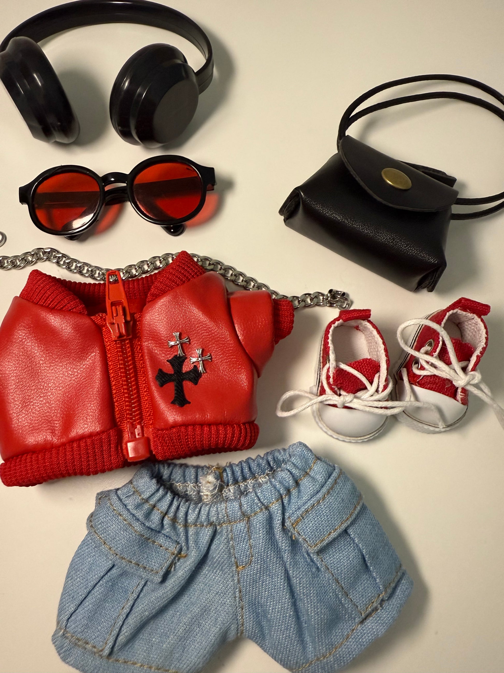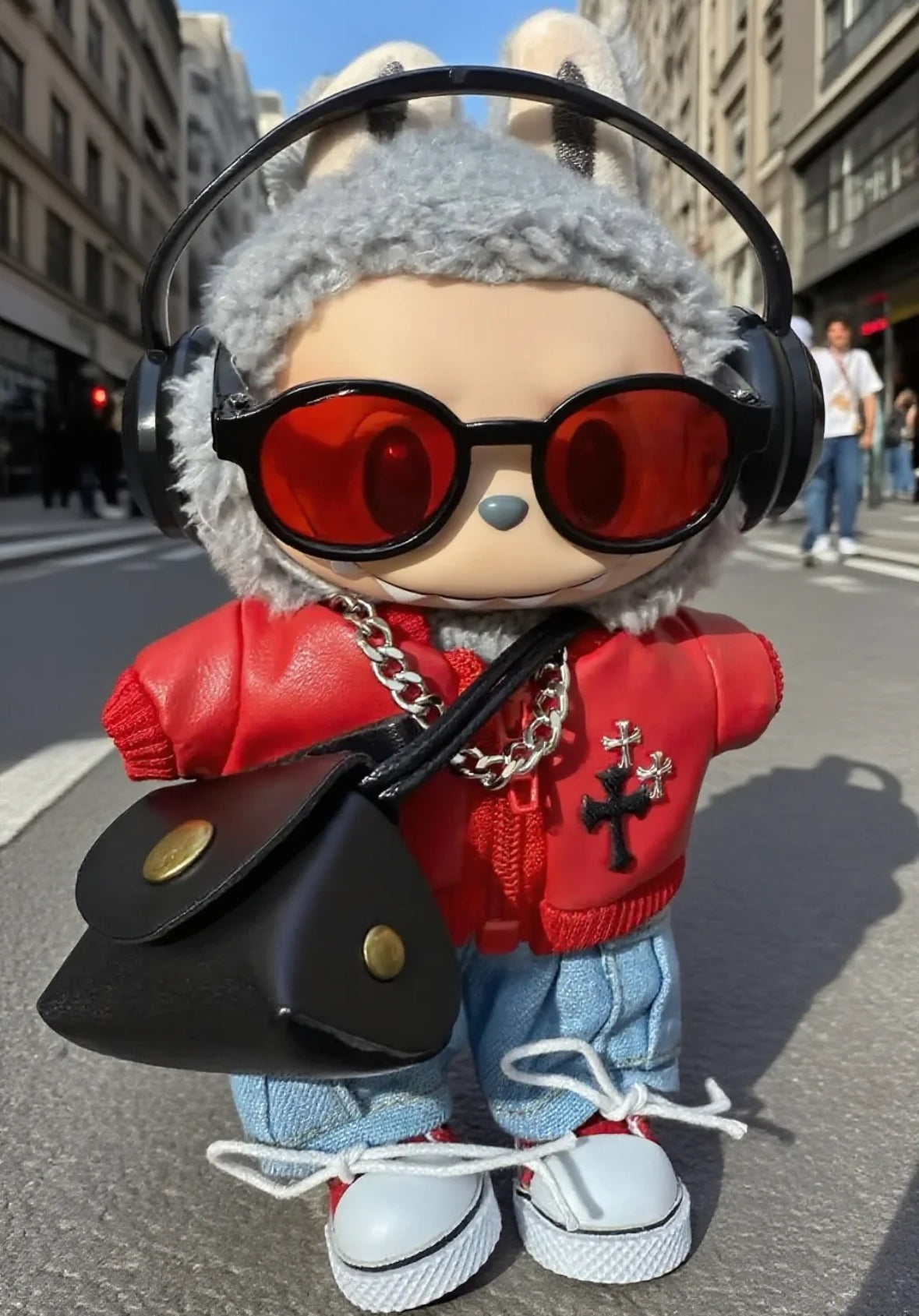 Bright, nostalgic, and full of vintage pop-star charisma — this Retro Red Idol Outfit transforms your Labubu into a standout little performer straight from a 90s music video. The bold red faux-leather jacket with cross details pairs perfectly with the iconic red-tinted round glasses, creating a playful yet stylish retro-idol aura. The chunky silver chain and black mini shoulder bag add fashionable attitude, while the studio-style headphones hint at backstage rehearsals and pre-show excitement.