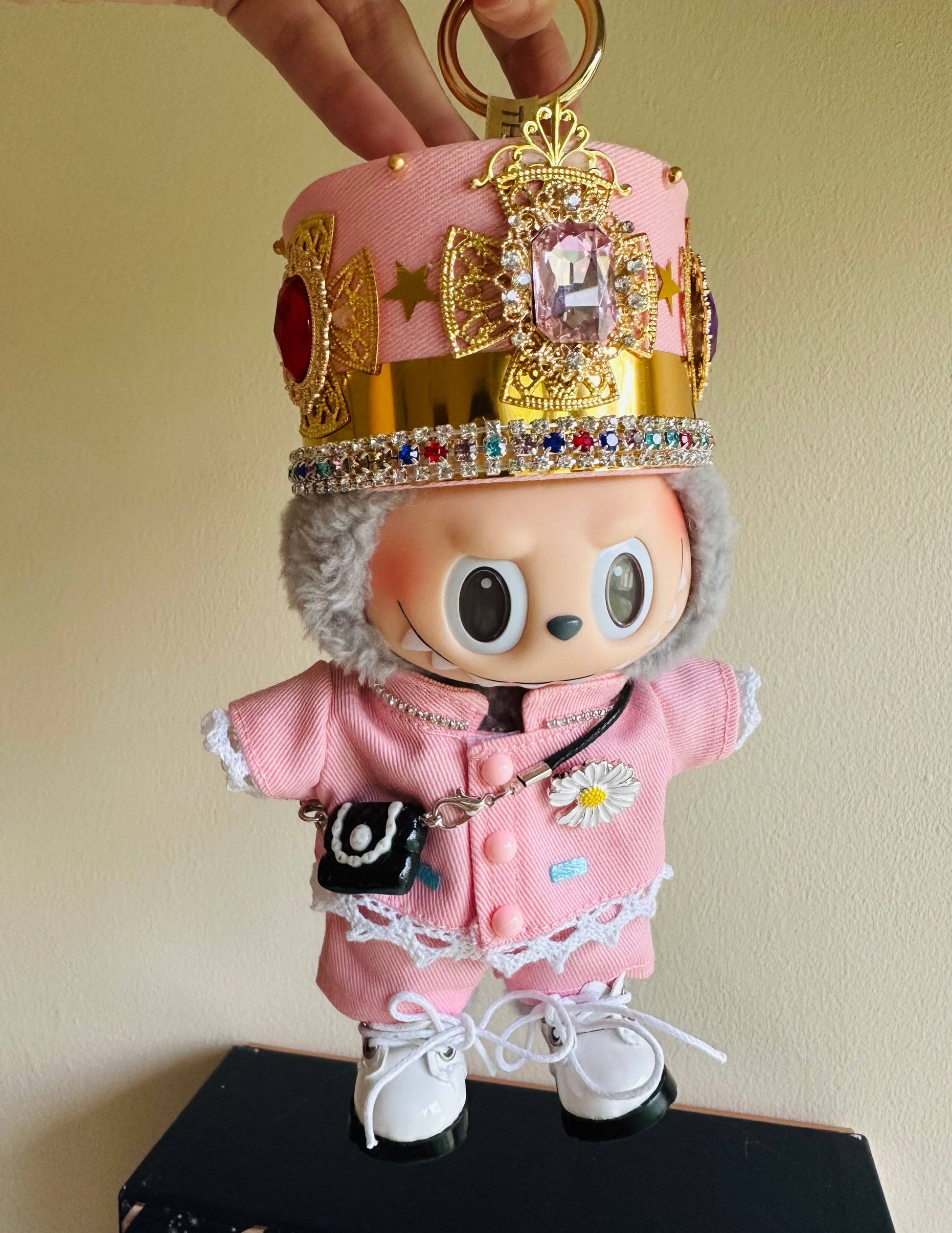 Bring high-fashion street vibes to your Labubu with this Royal Pink Street Style Outfit. Featuring a stunning handcrafted crown hat with colorful rhinestones and gold details, paired with a sweet yet edgy pink jacket and shorts. The daisy pin adds a playful touch, while the mini black bag and classic white lace-up shoes complete this statement look — perfect for collectors and photoshoots inspired by stage performance glamour.