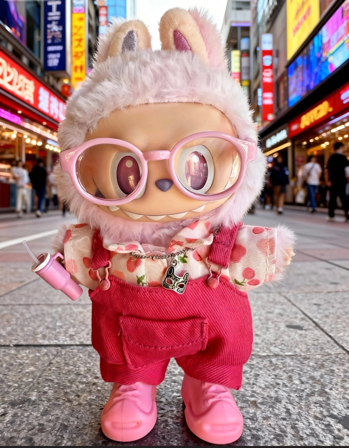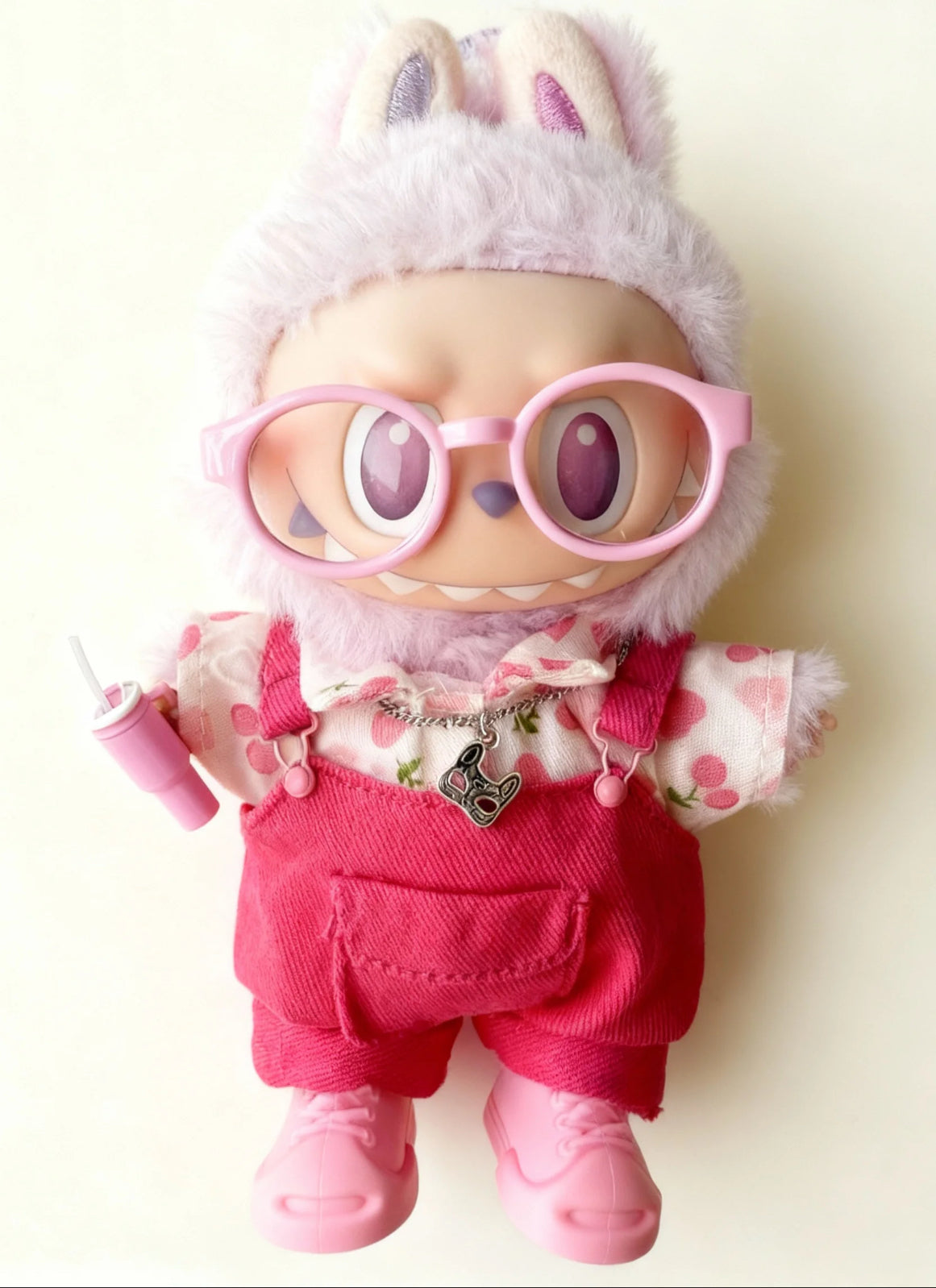 Perfect for collectors who love soft girl aesthetics, this outfit brings everyday charm to your Labubu display. The oversized pink glasses add a playful touch, the cherry blouse feels light and fresh, and the bright rose overalls create the perfect casual street-style vibe. Paired with pink shoes, a mini drink cup, and a silver bunny necklace, it’s a complete look that tells a story of a sweet girl strolling through town with her favorite drink.