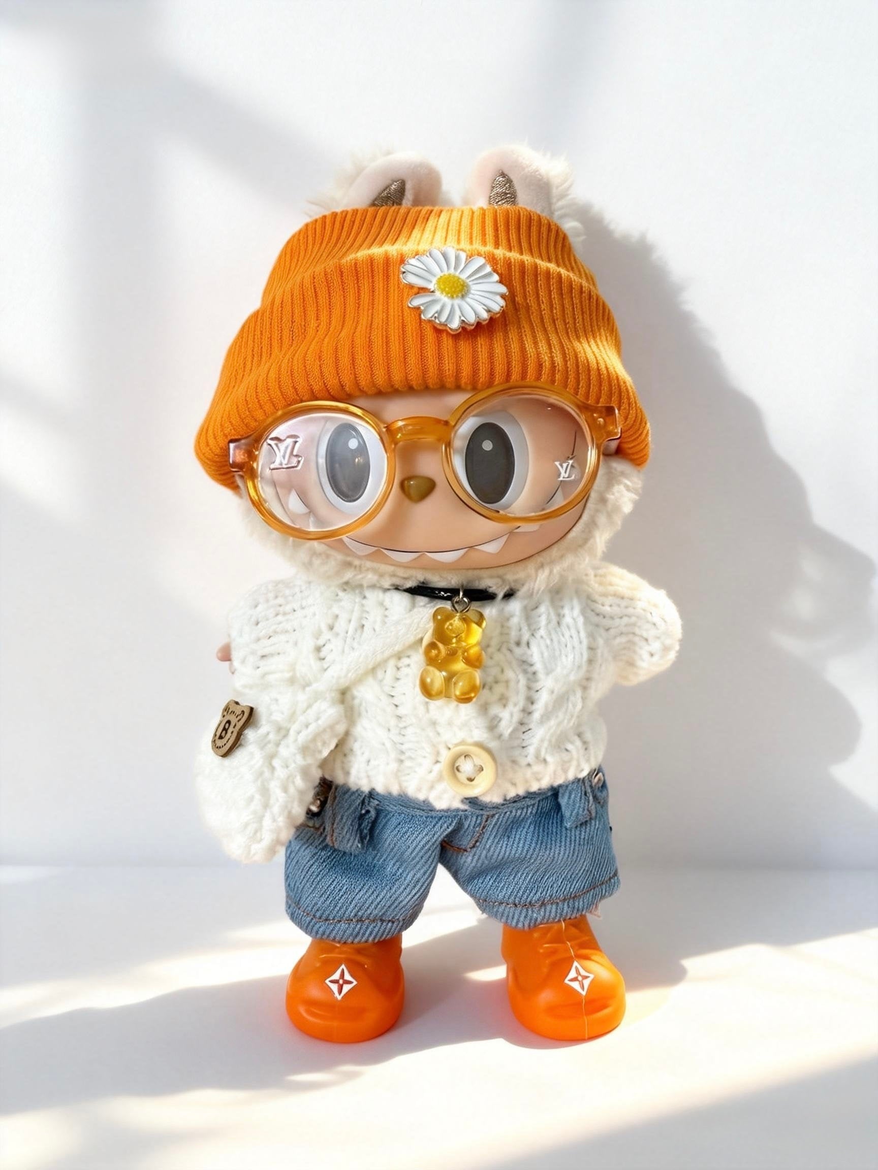 Cream cable-knit top paired with denim shorts, finished with an orange beanie, translucent glasses, and cheerful daisy details. Cozy, bright, and perfectly balanced between sweetness and style.